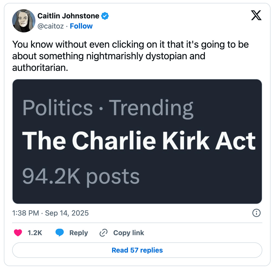 I’m just amazed at the virality of this whole thing. The American right’s frenzied emotional hysteria about the murder of Charlie Kirk has them promoting an initiative that is not meaningfully different from the Ministry of Truth proposed under the Biden administration’s “Disinformation Governance Board”, which was aborted after massive public outcry from the right. And that was just three years ago.