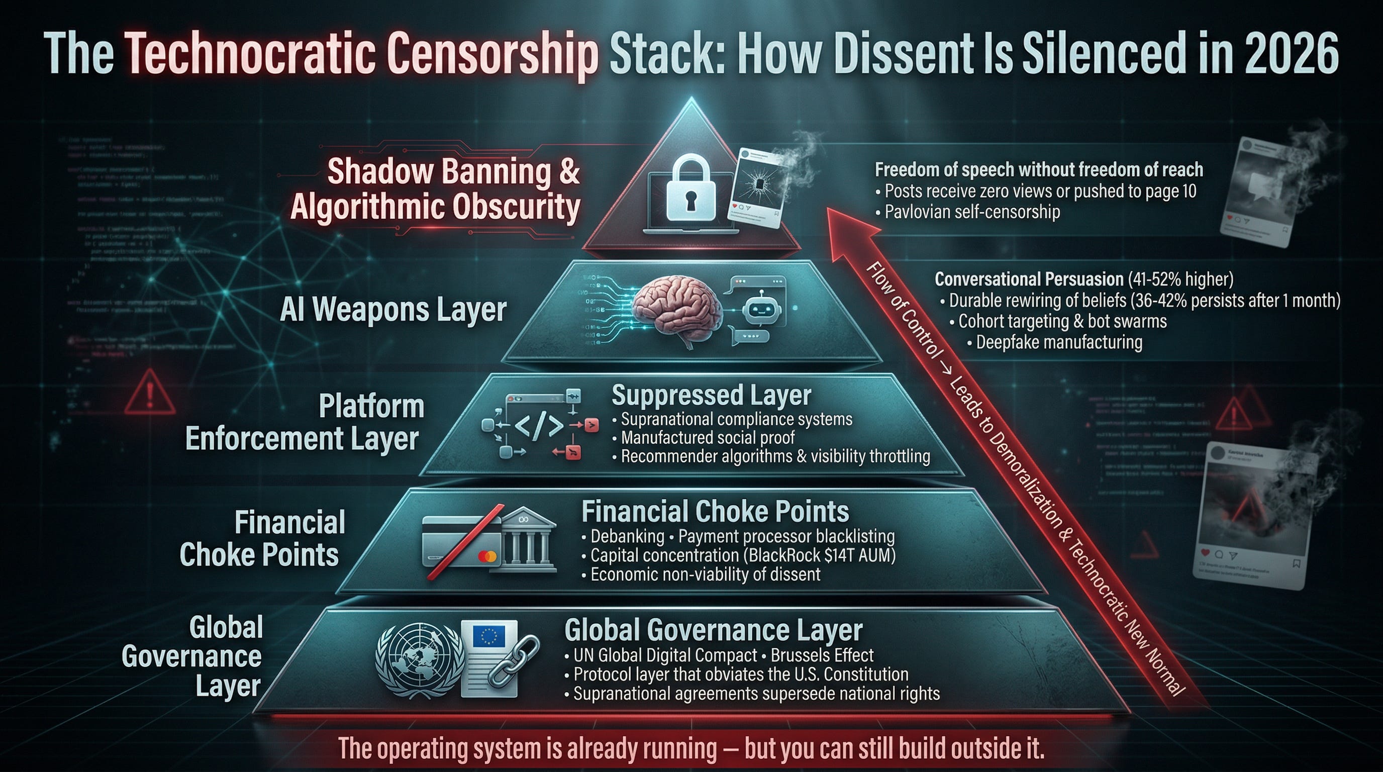Add debanking into that picture — payment processors and financial institutions quietly cutting off those who cross invisible narrative lines — and you have a full-spectrum control system.