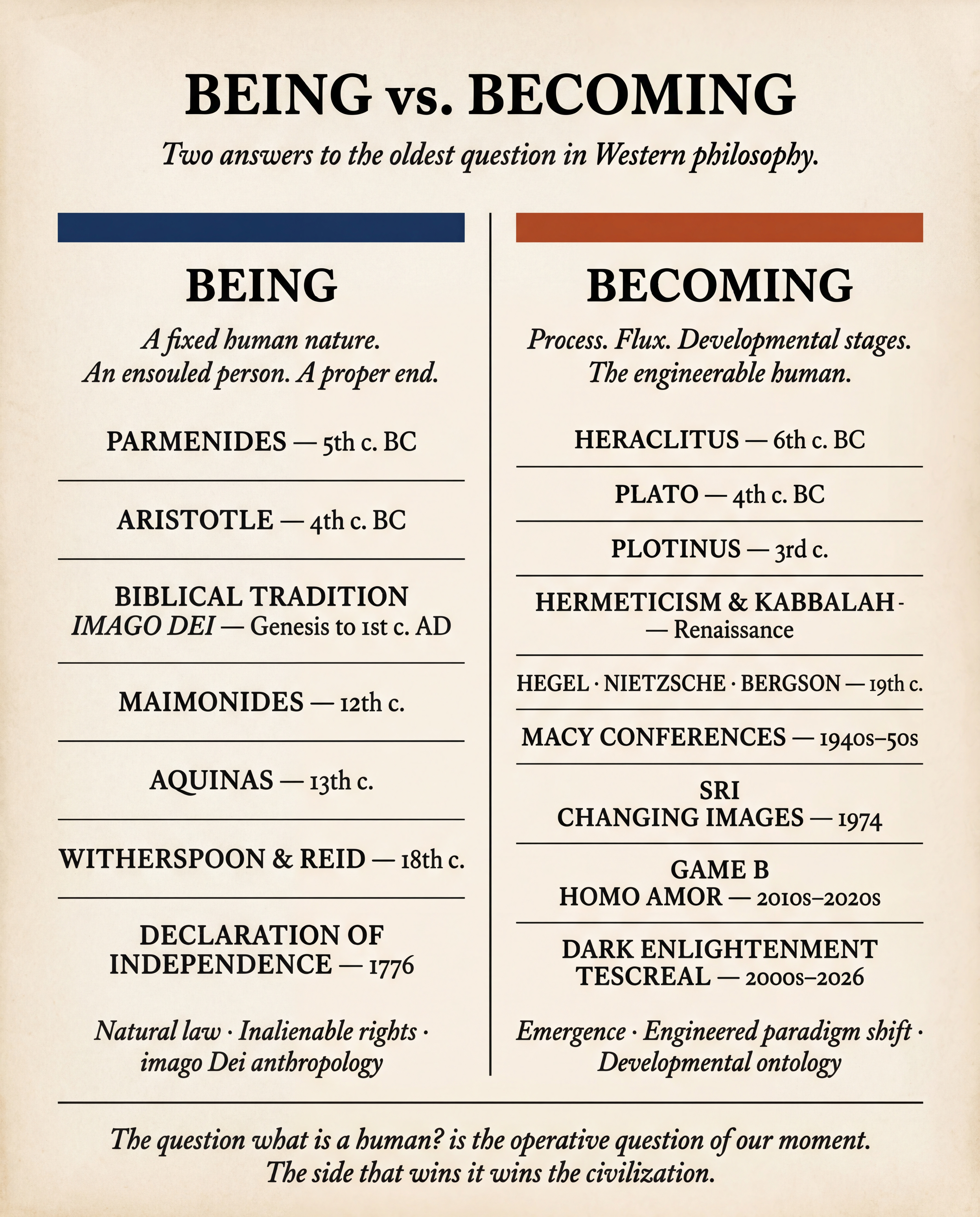 The Becoming answer, running in parallel the whole time, says the opposite — and it is worth stating it as its adherents would state it, without my own editorial intrusion, because the rest of this essay will be an argument against it. On the Becoming view, there is no fixed human nature. There is no stable soul. Consciousness, on this view, is not private and personal but distributed, emergent, engineerable. The human, its proponents argue, is what he is becoming, and what he is becoming can be shaped. There is no telos given in advance — only the telos we choose to impose. Heraclitus, on this view, was right: reality is process, the human is process, and processes can be managed. That is the claim. I do not accept it. But it is the claim, and readers need to see it clearly before they can see what the rest of this essay is going to do to it.