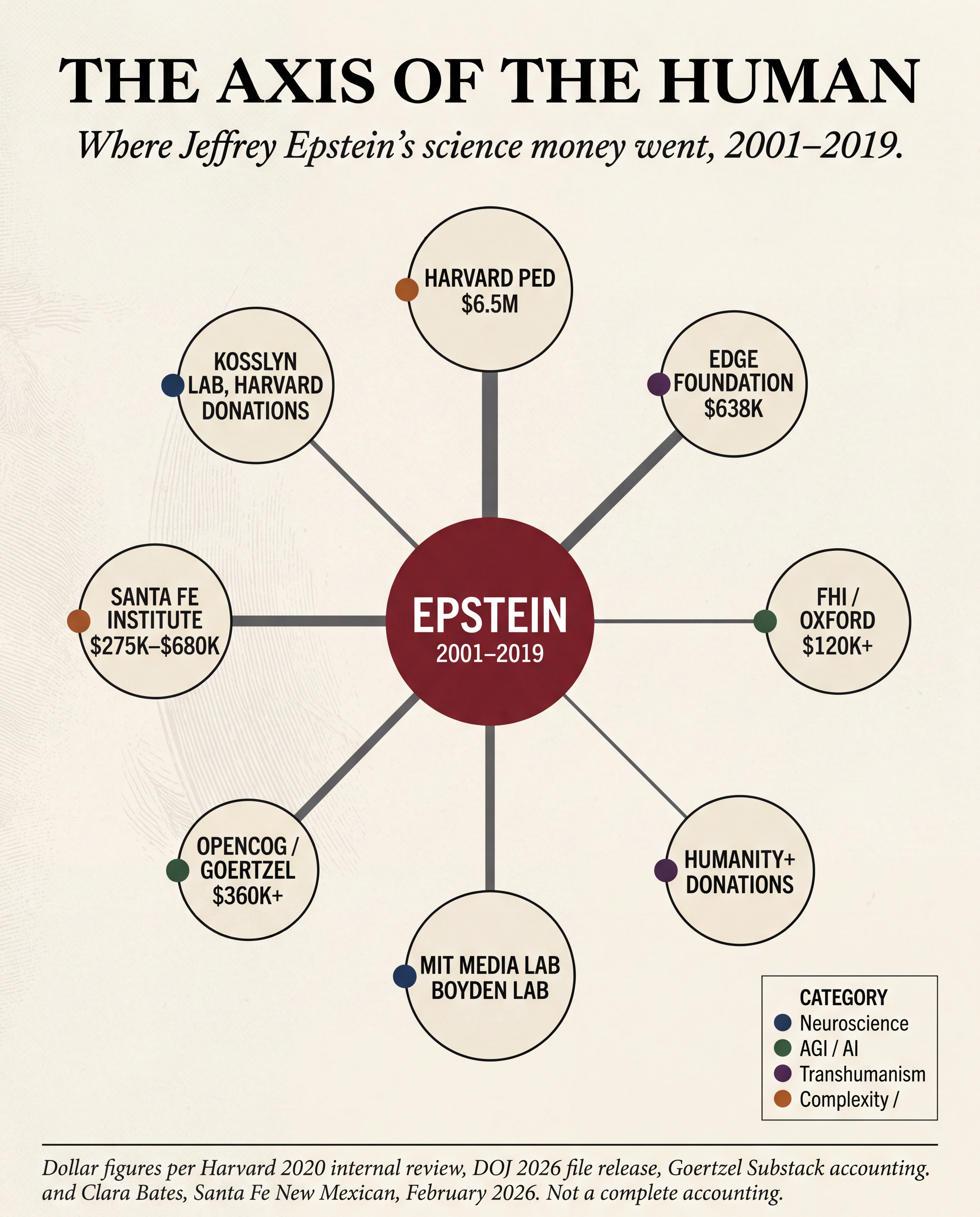 Look at where the money went. Harvard’s Program for Evolutionary Dynamics: $6.5 million to Martin Nowak’s lab, per Harvard’s own 2020 internal review. Nick Bostrom’s Future of Humanity Institute at Oxford: at least $120,000 in documented transfers. The World Transhumanist Association — co-founded in 1998 by Nick Bostrom and the British philosopher David Pearce, among other authors, to promote transhumanism as a serious academic and public-policy discipline, and rebranded in 2008 as Humanity+ — received documented Epstein transfers during the 2013–2014 period when Joscha Bach served as a research fellow under Bostrom there. The organization’s own Transhumanist Declaration commits the movement in its own words to “broadening human potential by overcoming aging, cognitive shortcomings, involuntary suffering, and our confinement to planet Earth” and to “life extension therapies; reproductive choice technologies; cryonics procedures; and many other possible human modification and enhancement technologies.” The companion Transhumanist Manifesto still live on humanityplus.org is more candid, stating plainly that “aging is a disease” and committing the movement to “mitigate aging and extend life beyond the maximum lifespan” — and the foundational 1990 essay that defined the modern use of the term “transhumanism,” Max More’s “Transhumanism: Toward a Futurist Philosophy,” (the original coinage was by Julian Huxley in 1957) names the movement’s goal explicitly as “our advancement into transhumanity and our future as posthumans.” The list continues. Ed Boyden’s optogenetics work at the MIT Media Lab. Stephen Kosslyn’s cognition lab at Harvard. The Edge Foundation: around $638,000 between 2001 and 2015. OpenCog, Ben Goertzel’s artificial general intelligence project — the same OpenCog that Gino Yu worked with, and that Yu discussed with Epstein by email as part of their collaboration.