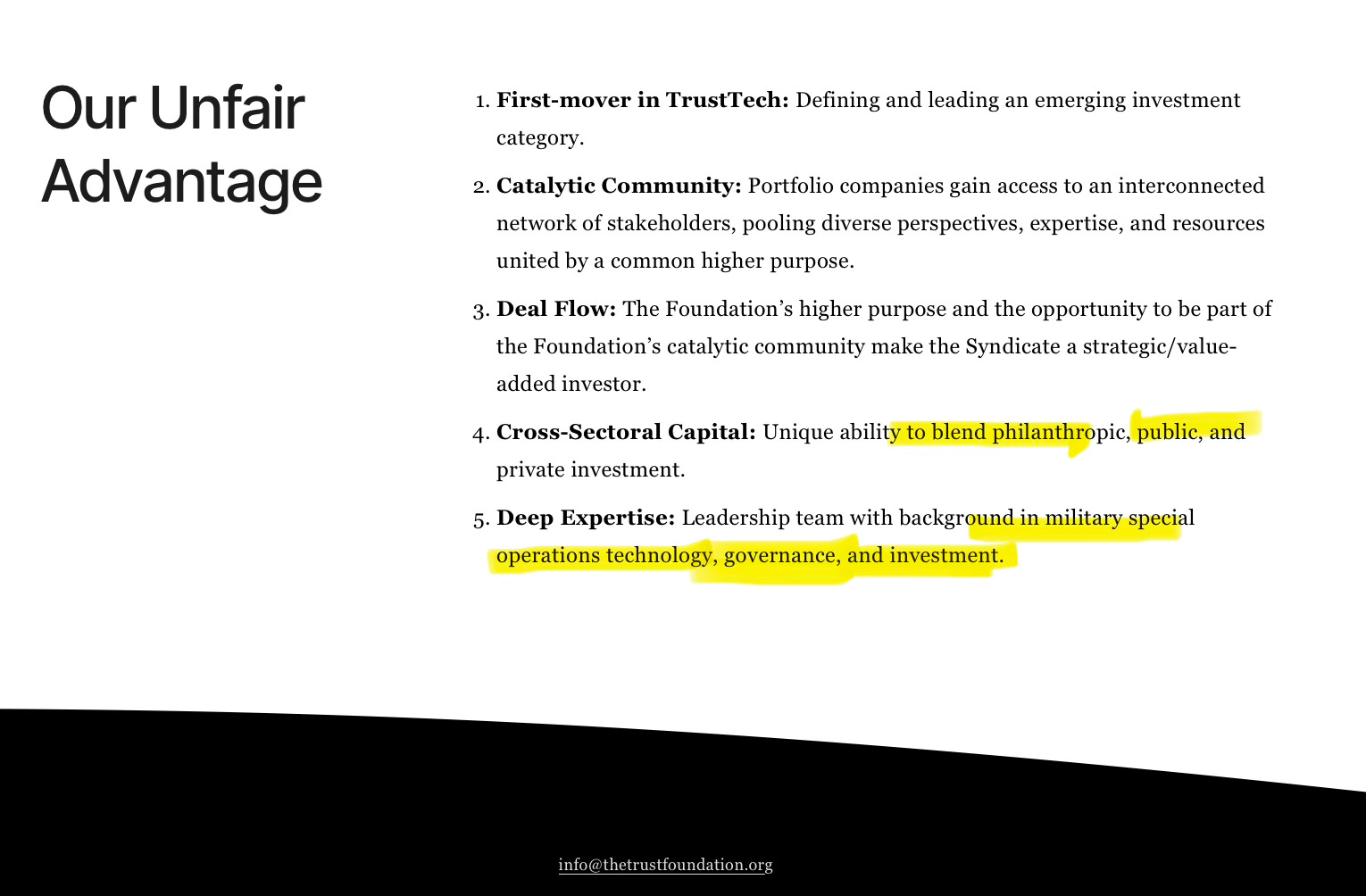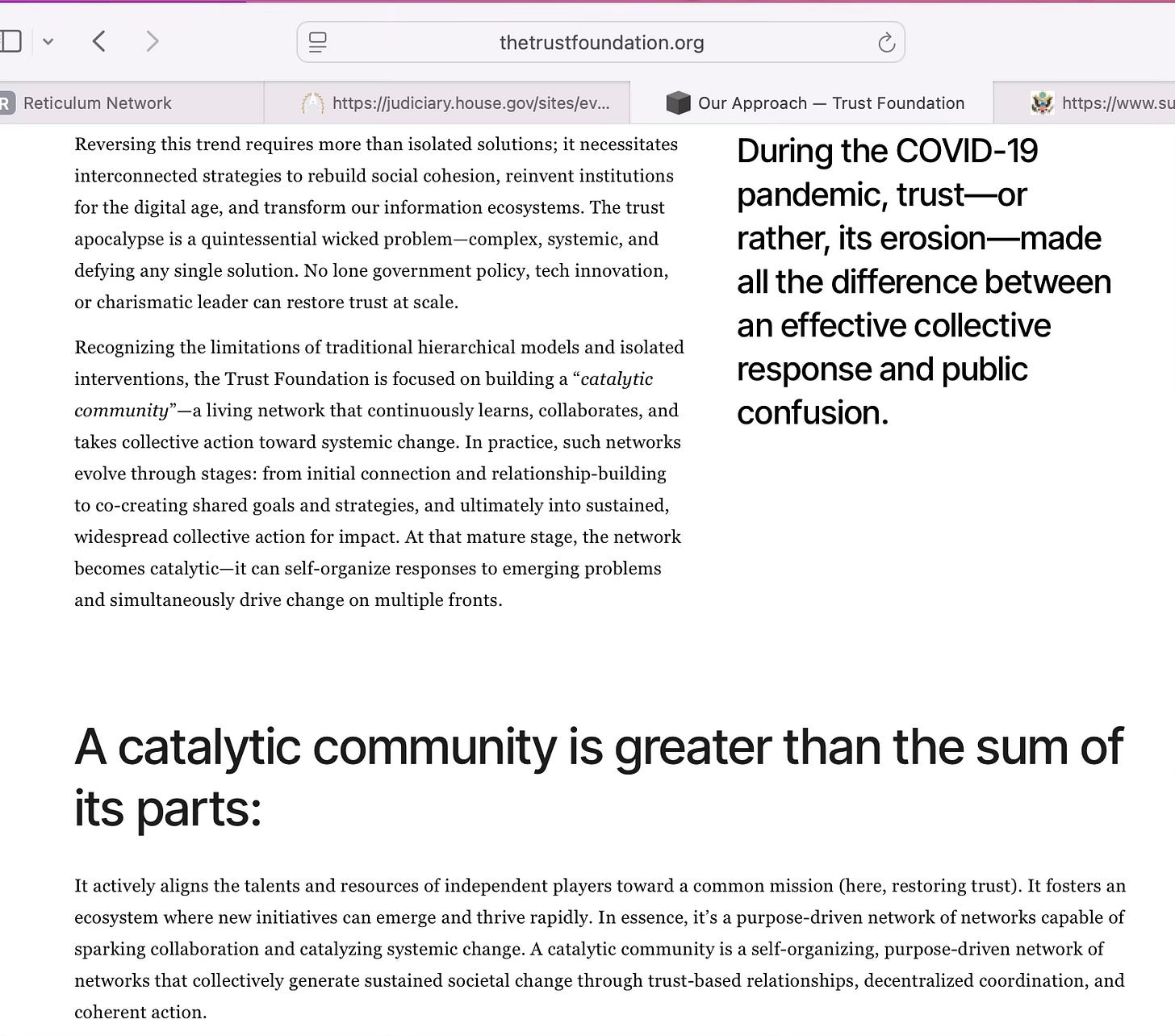 The catalytic language is not mine. It is the term of art that present-day vehicles in this ecosystem use to describe themselves. The Trust Foundation — a current-generation philanthropic-and-convening entity whose self-described mission is “combating the trust apocalypse” — explicitly names its operational model as “building a catalytic community.” Its published approach cites Stan McChrystal’s Team of Teams framework (from the Joint Special Operations Command’s decentralized-network restructuring during the Global War on Terror) and David Ehrlichman’s Impact Networks methodology as intellectual inputs. More consequentially for the argument this essay is making, the Trust Foundation names Peter Thiel’s off-the-record “Dialog” retreats as a direct inspiration for its convening methodology — “intimate groups,” “no small talk,” “100% off-the-record,” “cross-pollination” among “tech CEOs, academics, politicians, investors.” The self-description is the documentation. The catalytic-community architecture is not an archaic feature of the Epstein era. It is the explicit, branded, present-day operational framework under which this class of convening continues to be conducted, now repackaged under the banner of restoring “trust” — a framing that, placed alongside the World Economic Forum’s 2024 “Rebuilding Trust” annual-meeting theme, the post-2020 BBC-led “Trusted News Initiative” that coordinated major outlets on pandemic and election content, the “Trust and Safety” apparatus that governs speech on major platforms, and the broader “digital trust” infrastructure now being built around biometric identity and programmable-payment rails, carries a specific and freighted history.