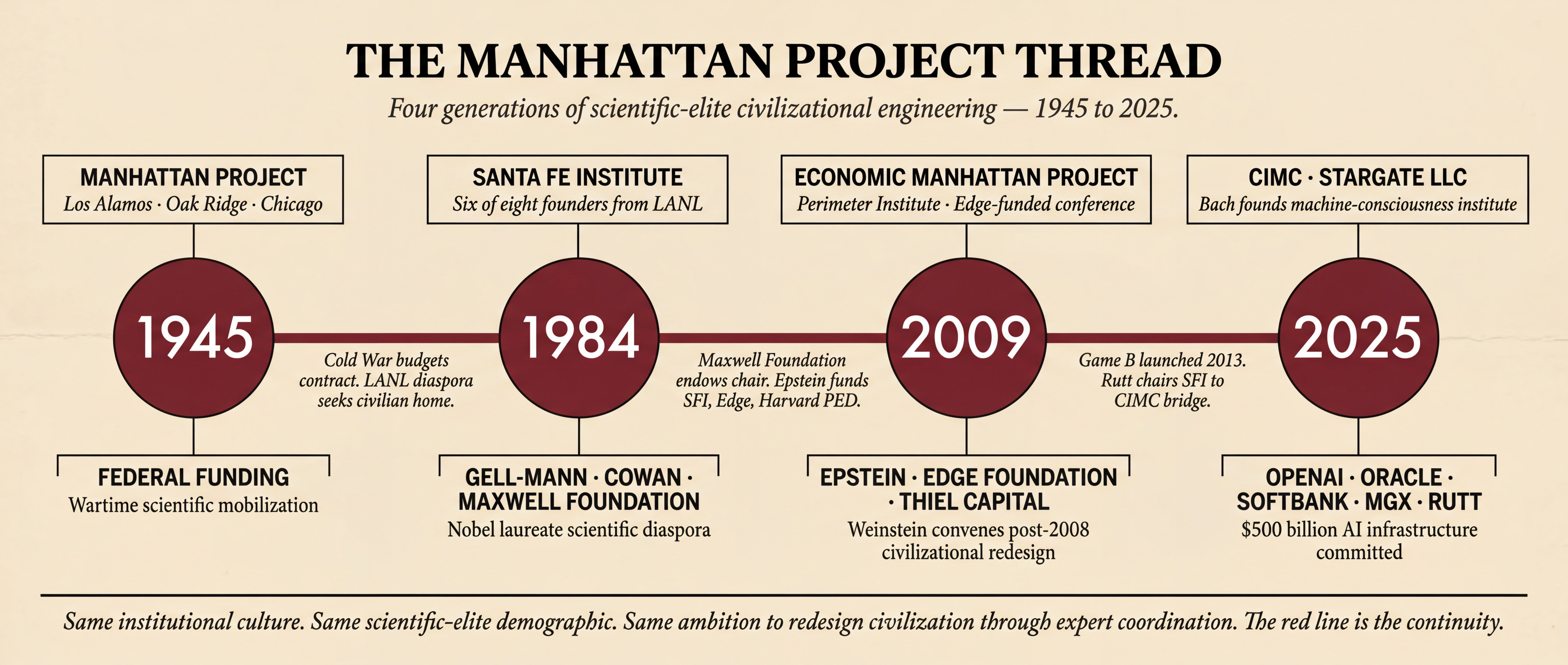 Read the lineage carefully. The eight founders of SFI in 1984 were six Los Alamos National Laboratory scientists plus Gell-Mann and Pines, and George Cowan — their leader — was a literal Manhattan Project chemist. Twenty-five years later, Eric Weinstein convened the Edge-and-Epstein-adjacent founding meeting of Game B and branded it the Economic Manhattan Project, at a physics institute, with SFI complexity-economics researchers on the panel. The rhetorical framing was not accidental. Weinstein was signaling — to the people in the room who knew how to read the signal — that Game B was self-consciously positioning itself as the next-generation continuation of the scientific-elite-led civilizational-engineering project that SFI had represented in the 1980s and 1990s. The Manhattan Project metaphor was the thread connecting them, passed from nuclear weapons to complexity economics to civilizational redesign across three generations of the same institutional culture.