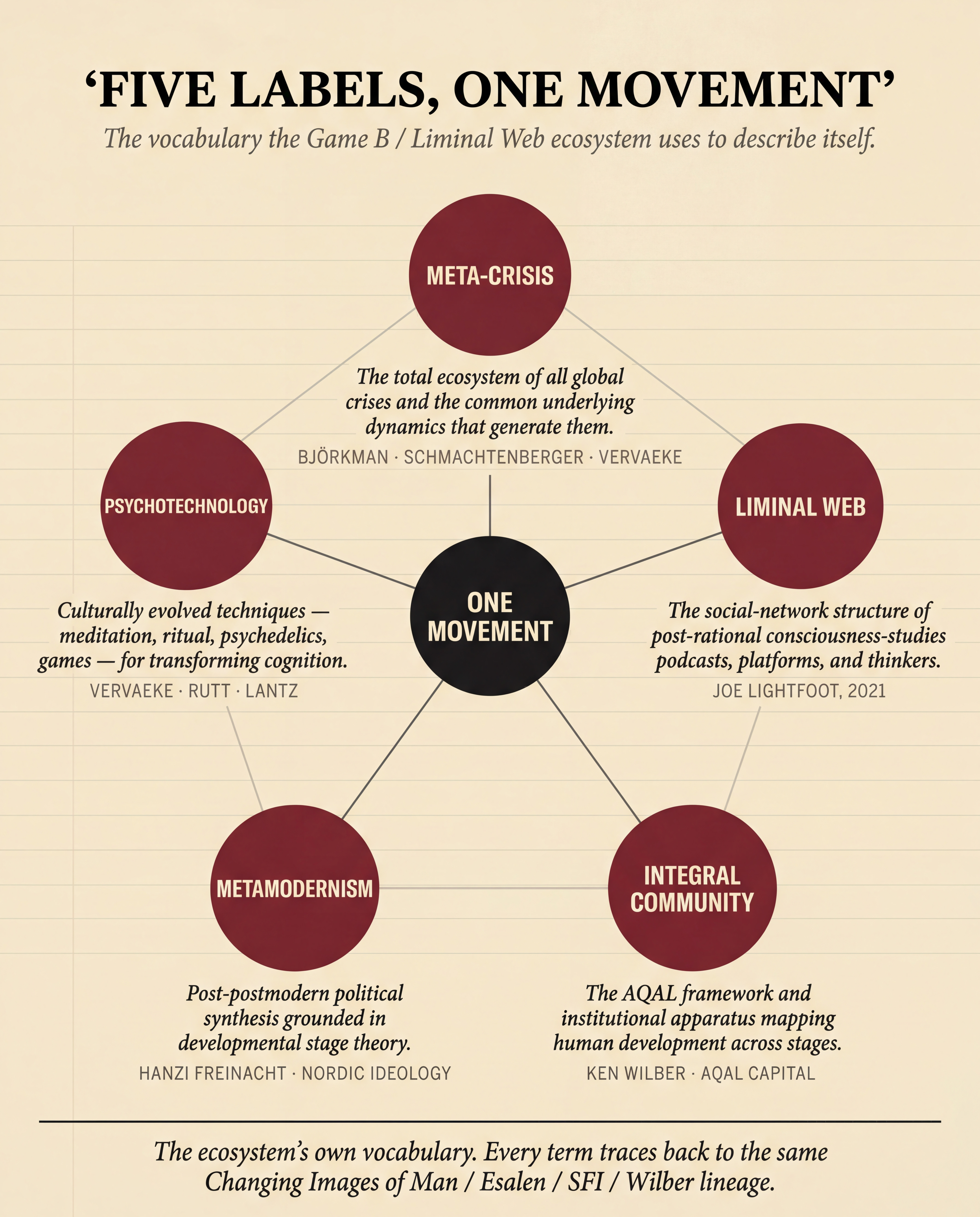 The ecosystem has its own word for the method by which it intends to move individual humans through the transition: psychotechnology — a term John Vervaeke elaborates across his twenty-two-hour Awakening from the Meaning Crisis lecture series as “a socially generated and standardized way of formatting, manipulating, and enhancing information processing that’s readily internalizable into human cognition, and that can be applied in a domain-general manner,” and that Jim Rutt names in his own self-catalogued core vocabulary as “a set of culturally evolved techniques, tools, and practices designed to enhance cognitive function, emotional regulation, and social interaction” — with meditation, shamanism, mindfulness, ritual, psychedelics, and altered-states practice all explicitly named by Vervaeke as instances of the category. On Rutt’s podcast, game designer Frank Lantz identified games themselves as “a kind of psychotechnology that are similar in a way to meditation, to intoxication, to intentionally entering these forms of altered states” — which is precisely Gino Yu’s research program stated in Game B’s own vocabulary, by a Game B guest, to the movement’s most prominent podcast host. Meta-crisis names the problem; Liminal Web names the community; integral community names the map of human development; metamodernism names the politics; and psychotechnology names the method. Five labels, one movement. And every one of them, traced back, lands inside the same Changing Images of Man / Esalen / SFI / Wilber / consciousness-pipeline lineage this essay has been following.