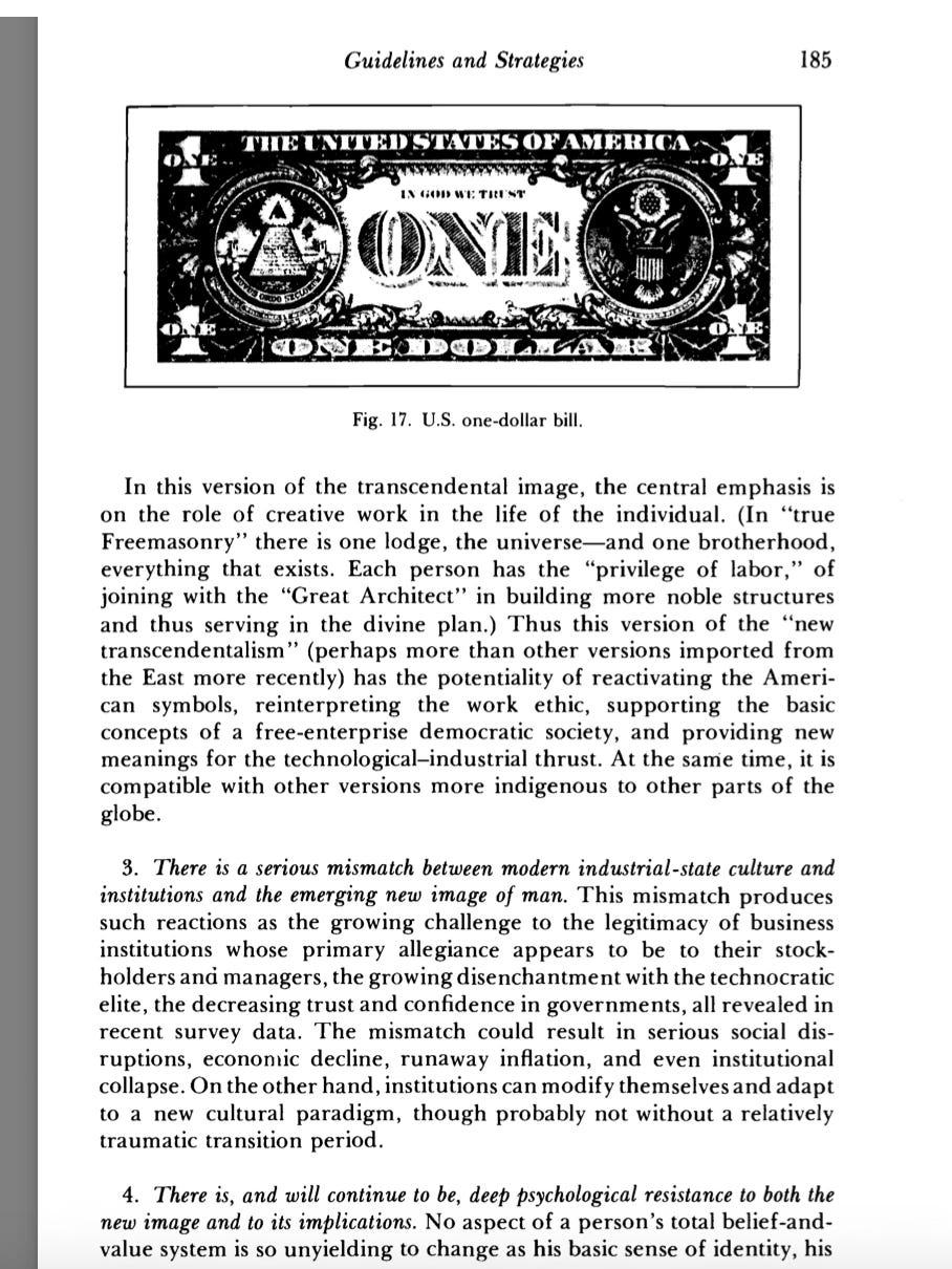 What the text does do is argue — explicitly and repeatedly — for a deliberate transformation of the Western image of the human. It treats the dominant modern images — what it calls the “economic man” image and the mechanistic-reductionist scientific image of the industrial era — as exhausted and misaligned with the ecological and social realities of the coming century. It calls for what it describes as an “integrative, evolutionary” image rooted in a synthesis of ecological holism, depth psychology, parapsychological and consciousness research, and what the report explicitly names as the Perennial Philosophy — the book’s Chapter 2 table of contents lists “The human as spirit — the view of the perennial philosophy” as one of its “formative images of man-in-the-universe,” alongside the Gnostic, Greek, Christian, Darwinian-Freudian, behaviorist, humanist, and systems-theoretic images. That is the primary source locating itself, in its own table of contents, inside the Huxley-and-Blavatsky perennialist lineage this essay has been tracing. The report argues that the engineered shift from the old image to the new image is itself the central civilizational task of the coming era, to be catalyzed deliberately through education, leadership, and narrative renewal. Figure 17 of the report is a reproduction of the U.S. one-dollar bill, and the text discusses the “potentiality of reactivating” the symbolism of the Great Seal, attested (in the report’s own words) “by the symbolism of the Great Seal,” as a resource for legitimizing the transition. It cites with approval the need for Western society to absorb Eastern contemplative traditions and their teachings on the unity of consciousness. And it frames all of this in the language of paradigm shift — applying Thomas Kuhn’s framework, as project director O.W. Markley later confirmed, not to a scientific discipline but to the total self-understanding of a civilization, making Changing Images of Man by Markley’s own account “the first known formal research study applying Thomas S. Kuhn’s ideas about ‘paradigm change’ to a whole society.”