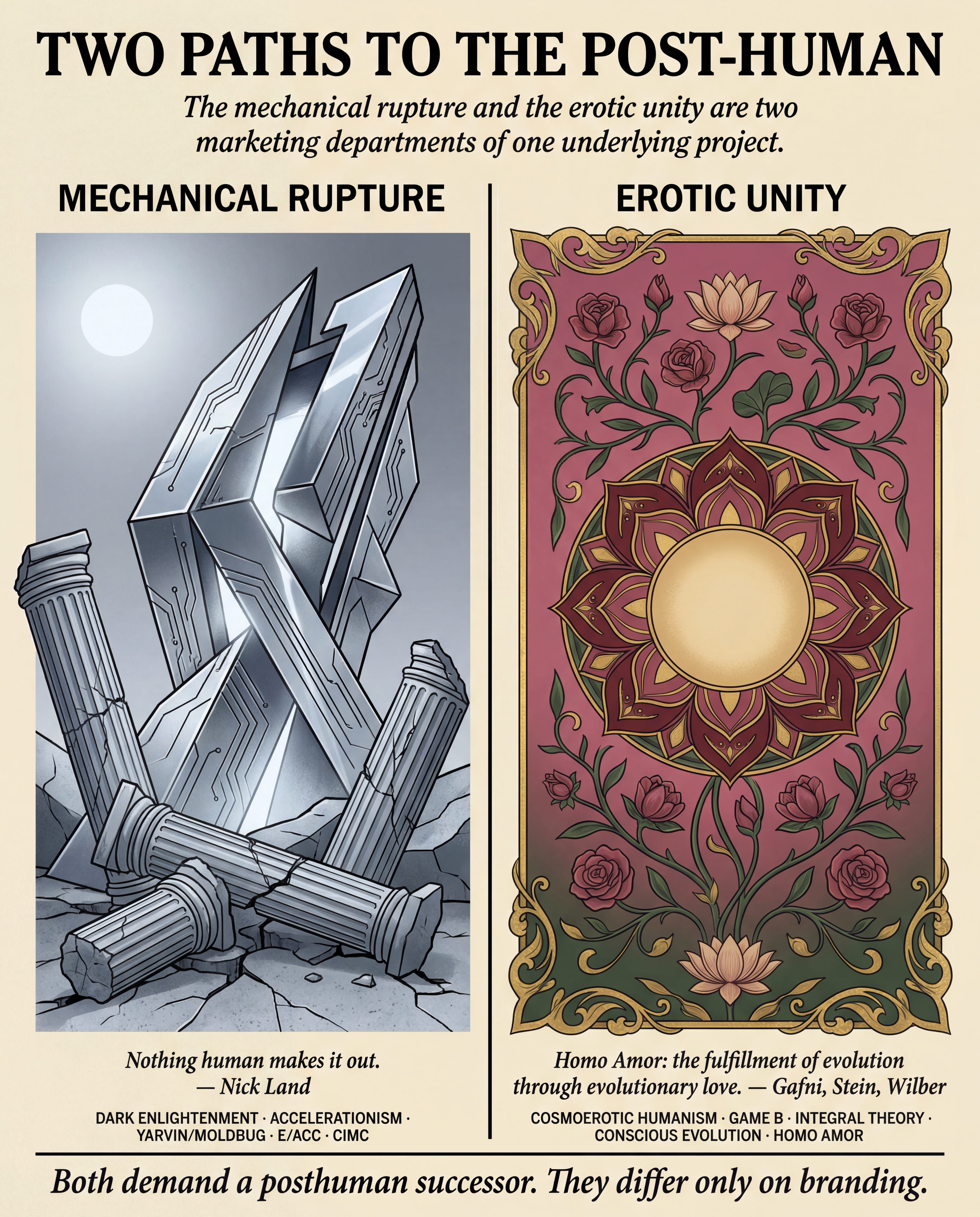 My argument — then and now — is that despite the genuine discrepancies among the proponents, these two visions are not opponents. They are the two available PR strategies for the same underlying project regardless of intentions. Both agree that Homo sapiens as currently constituted cannot remain the end of evolution. Both demand a posthuman successor. They differ only on branding. Land says the replacement will be violent, inhuman, and inevitable — and he celebrates it. Gafni, Stein, and Wilber say the replacement will be conscious, loving, and participatory — and they invite you into it. One side markets rupture. The other side markets romance. Both ends justify dissolving the sovereign human being that currently exists.
